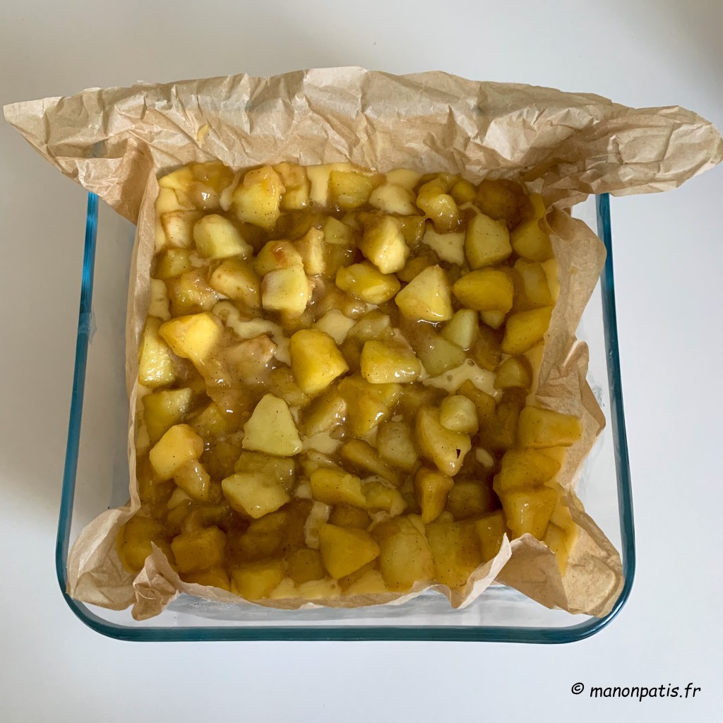 - Préchauffez le four à 180 degrès. Versez la pâte dans votre moule préalablement recouvert de papier cuisson, puis les pommes.