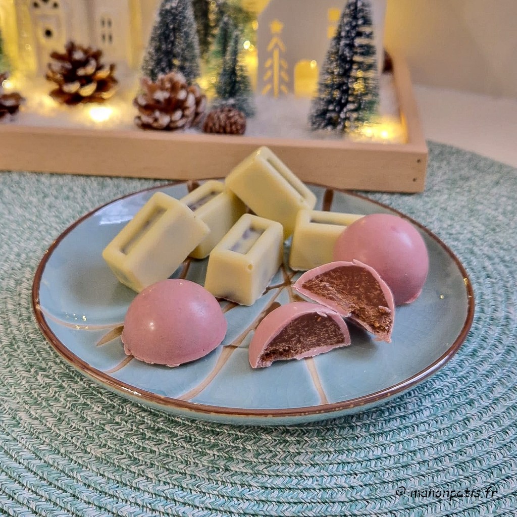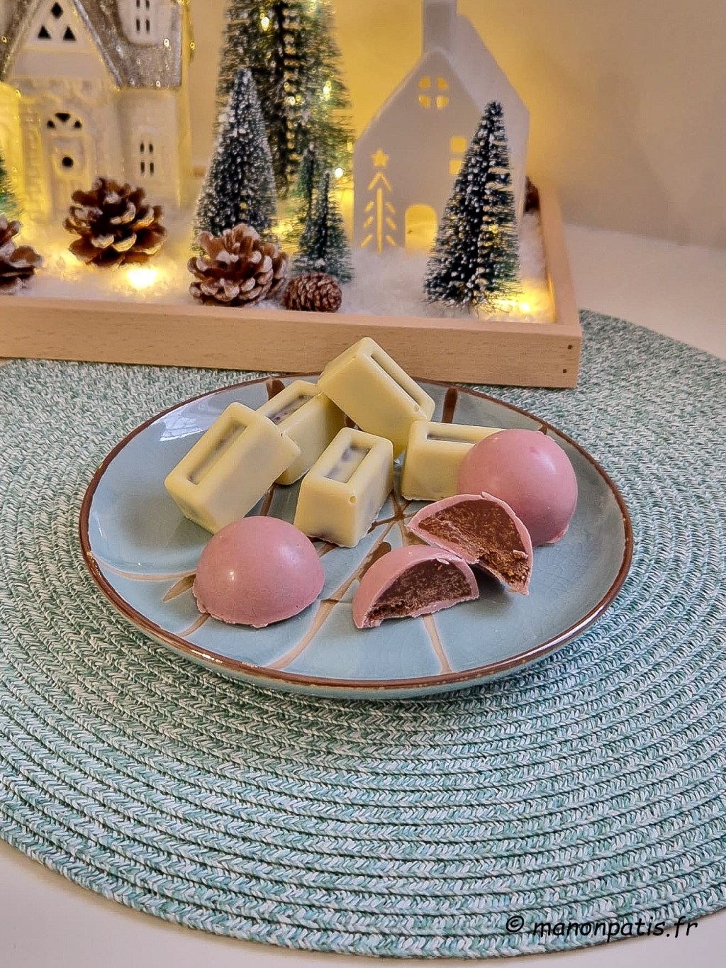 - Enfin, faites fondre le reste de chocolat blanc et ajoutez le colorant de votre choix. Recouvrez la garniture avec du chocolat, étalez avec une spatule ou un couteau et enlevez l’excès. Faites figer 20 minutes au congélateur, puis démoulez les chocolats. Laissez-les tempérer minimum une heure avant de déguster. Ces chocolats se conservent 2 semaines à température ambiante, à l’abri de la lumière.