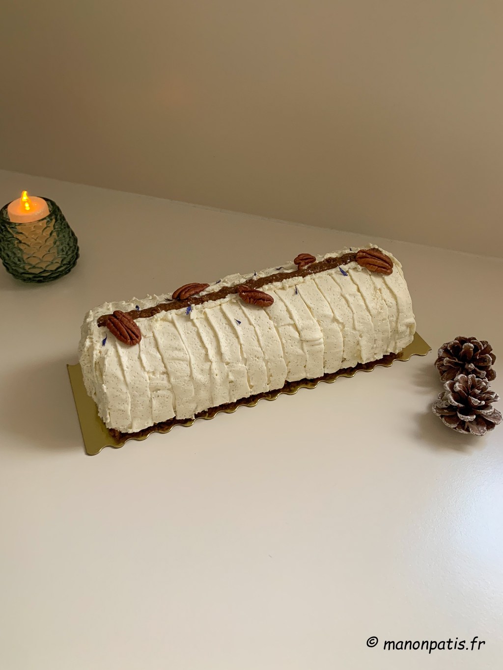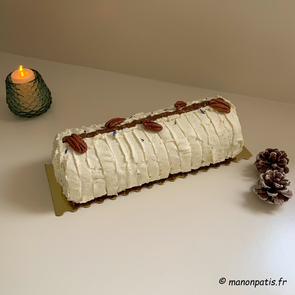 - Démoulez la bûche et pochez le reste de ganache vanille en réalisant le pochage de votre choix. Vous pouvez également utiliser le reste de praliné pécan, des noix de pécan ou encore réaliser des décors en chocolats, des décorations en sucres… À vous de vous amuser !